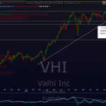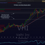 T1 has been hit for a 6.5% gain (from entry, not breakdown as i was late posting this one out so i will always use the breakdown/breakout price if posted at or before breakout or the price at the time of the first post, if i triggered trade is posted for the first time). fwiw, as of now, i still favor T3 being hit on VHI over time. however, consider lowering stops if you took the trade.