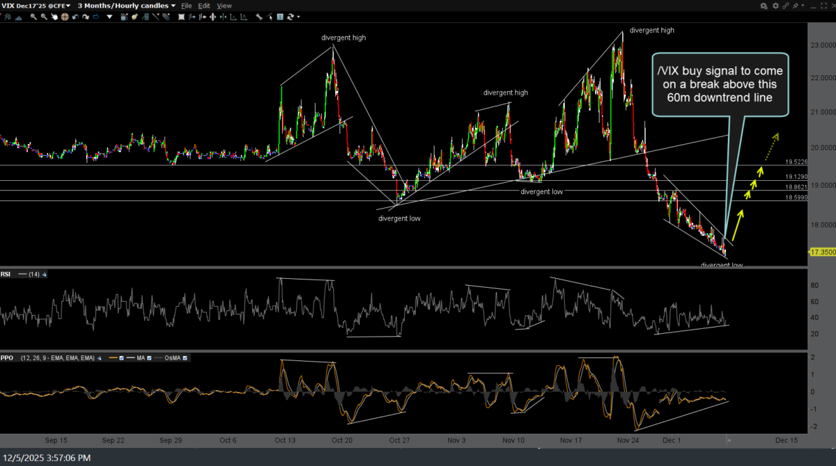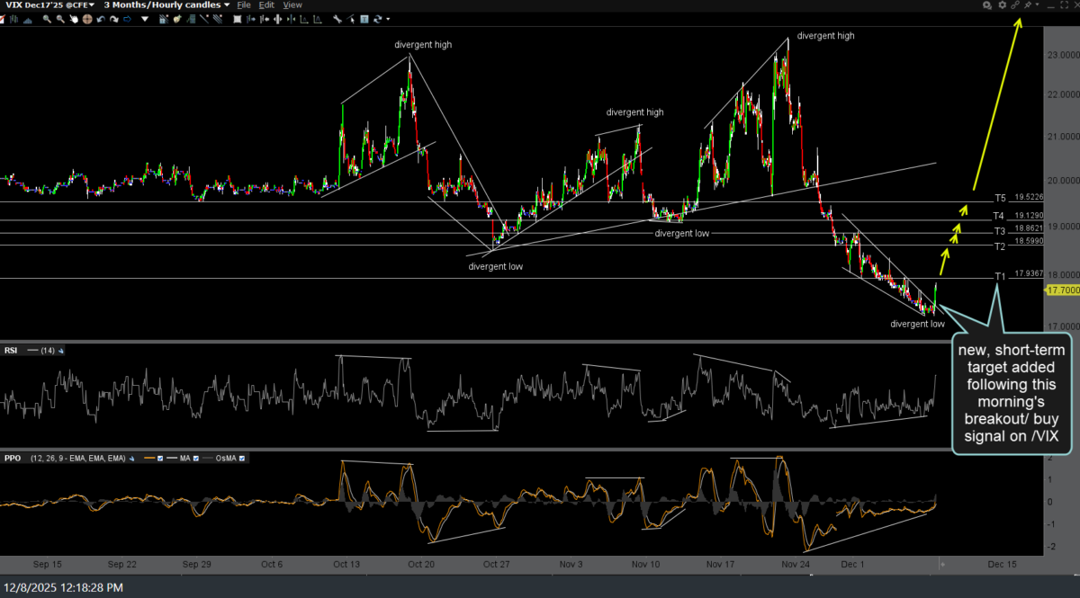 Here’s a new, short-term target added following this morning’s breakout/ buy signal on /VIX ($VIX futures) for active traders that might want to book the quick but relatively small gain before the market-moving FOMC rate decision on Wednesday afternoon. Longer-term swing targets remain as previously posted on the daily charts. Previous (Friday’s) & updated 60-minute charts of /VIX below.