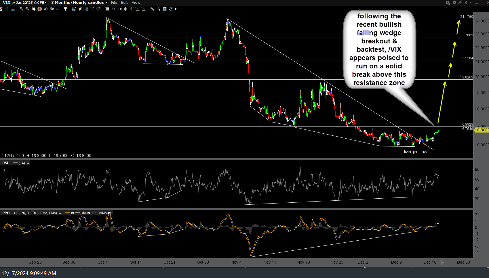 Following the recent bullish falling wedge breakout & backtest, /VIX (Jan $VIX futures contract) appears poised to run on a solid break above this resistance zone with price targets shown at arrow breaks on the 60-minute chart below.
