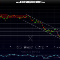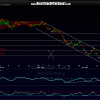 for example, here’s the string of 60 minute charts on the current X long. X triggered a long entry on the breakout of this falling channel, then offered a chance to take full or partial profits at the first target that same day. the stock proceeded to move beyond T1 (which then became support) allowing stops to be moved up just below that level to assure a profit on the remaining shares. today, X is selling off like most everything else and is quickly approaching the break-out level which would be a 2nd objective stop level and assure a breakeven, or possibly a very small loss, depending on where one entered the trade. sometimes i will allow for a re-test of a recently broken trendline but in the case of X, it could be quite a while before prices fall back to test that down channel from above and is too far away for stop IMO. therefore, consider X a completed trade (stopped out) if prices fall below that horizontal line on the most recent chart below.