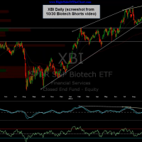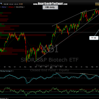 XBI was one of several alternative ETF’s that were covered in the Oct 30th Biotech Short Trade Ideas video, although the IBB (Nadaq Biotechs ETF) was & remains my preferred vehicle for those preferring to short ETF’s vs. individual stocks. I just wanted to point out that the XBI has hit that first target level that was covered in the video for those who shorted it and might be looking to book partial or full profits. T2 is my preferred target but note that there are also some positive divergences on the 60 minute chart of XBI so we could see a bounce from around these levels.
