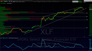 here’s a 5 min of XLF and some targets for that time frame for a short trade which would trigger on a break of this rising wedge. being that there’s only 45 min left in the trading session, this might not trigger until tomorrow and if it does trigger today, would likely take until tomorrow for the target(s) to be hit. if any active traders are interested in this set-up, FAZ is probably the best trading vehicle since this would be a quick pull-back trade probably lasting only a day or two.