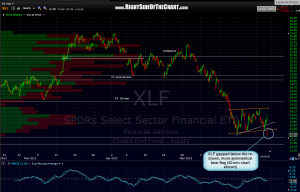 prices gapped below yesterday’s re-drawn bear-flag on the XLF 60 minute chart which should portend more downside. however, the day is very young and i can almost feel the fed’s heavy hand in this market so be careful. personally, i only have one long hedge left right now and will probably remove that soon but i still a have decent amount of dry powder to add to more shorts which i may do here soon. some of my favorites remain the financial stocks that i posted as flagging on friday as well as some of the brokers covered in the recent investment brokerage video like SCHW and AMTD. the REIT’s also continue to look attractive on the short side (short IYR, long SRS, or DRV, or you could short one of the leveraged longs for the added decay, like DRN but remember to adjust your position size accordingly not only for the inherent volatility in that sector but more so to account for the leverage. however, the risks and return potential of trading anything right now is much higher than usual (larger than usual gains or losses) so if you are not experienced or comfortable with trading this type of market, there is nothing wrong with going to cash and watching from the sidelines. i continue to think that the potential for a very sharp decline is elevated right now so be careful, don’t get married to any one position, long or short, and be careful what you take home over the weekend.
