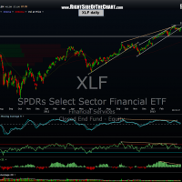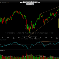 Here’s the updated daily chart along with a 2-day period chart of the XLF short. I tried to get that post out with enough time before the close for those interested to act on but as the etf has opened higher today, the entry price will be slightly better. At this time, I am focusing on just one price target, 17.25, with stops on a move over 18.60, giving this trade about a 3:1 R/R. However, I very well may add additional downside targets depending on how both XLF and the broad markets play out going forward. XLF is the 1x long etf for the financial sector and due to the close proximity and relatively short expected time frame for this trade, one could opt to use SKF (2x short financials etf) or possibly even FAZ (3x short financial sector etf) as a proxy for the trade. If so, make sure to adjust your position size accordingly to account for the increased leverage.
