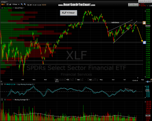 overall, i still favor trading the best looking individual stock patterns vs. the broad market or sector etf’s, but i do think that the XLF looks like an objective short here as it recently re-tested this recently broken bearish rising wedge pattern, which also coincided with a nice resistance zone. stops somewhat above the top of that resistance zone. first target is marked although i may add additional targets if this trade starts to play out. 4 hour chart shown.