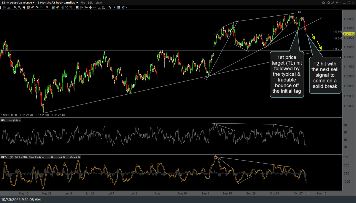 /ZB (30-yr Treasury bond futures) has just hit the second price target (T2), following the recent hit & typical/tradable bounce off the first price target (uptrend line). Remember, although TLT is the sister trade (alternative proxy for shorting the long bond), as a futures contract that trades virtually around the clock, /ZB will often have additional or different trendlines & price support levels that don’t exist on the 9:30-4 pm trading TLT. Previous & updated 60-minute charts below.