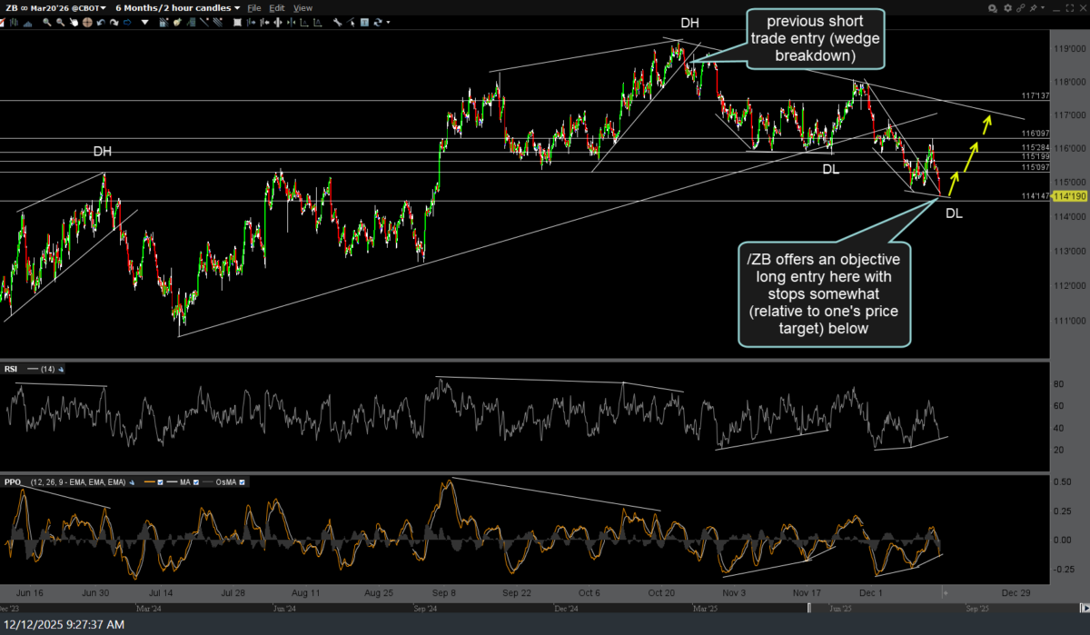 Wash. Rinse. Repeat: After milking nearly all of the previous drop from the Oct 22nd highs to the recent lows by shorting /ZB & TLT (30-yr T-bond futures & ETF) on the bearish rising wedge break & covering at the final target (first of the uptrend line or 87.24 price support level on TLT), it now appears to be an objective time to run it the other way (long) as TLT has now hit that 87.24 price support level with bullish divergences in place on the 60-minute chart. Stops should be relative to one’s preferred price target(s). Updated TLT 60-minute chart & /ZB 120-minute charts below.